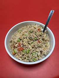 Basmati rice / edamame / red bell pepper / green onion / chopped chicken / scrambled egg / soy & sesame (gf)
