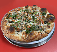 Garlic butter & sesame seed crust / vegetarian kimchi / baby spinach / pickled mushrooms / cheese blend / green onion / maple drizzle (veg)